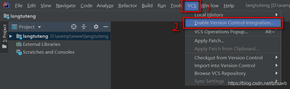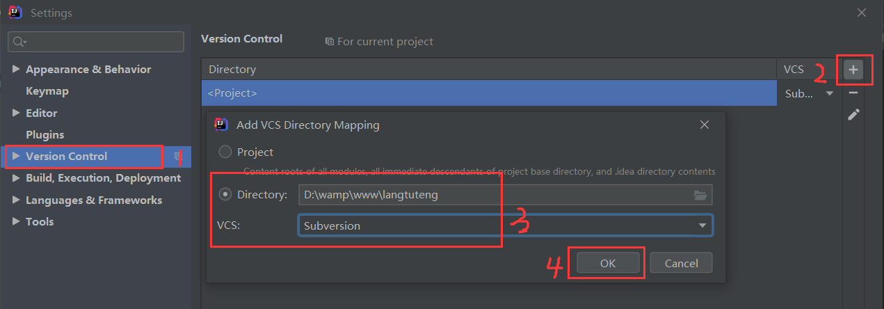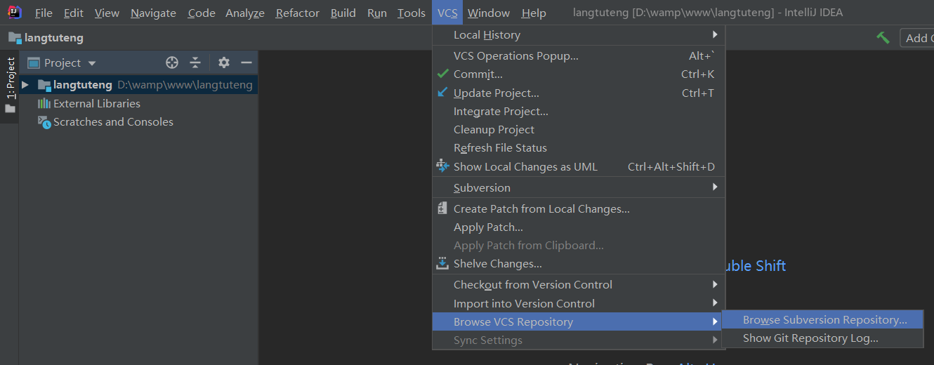 当再次打开 VCS 菜单时,可以看到多了很多选项,按下图选择,添加 SVN 资源库地址。