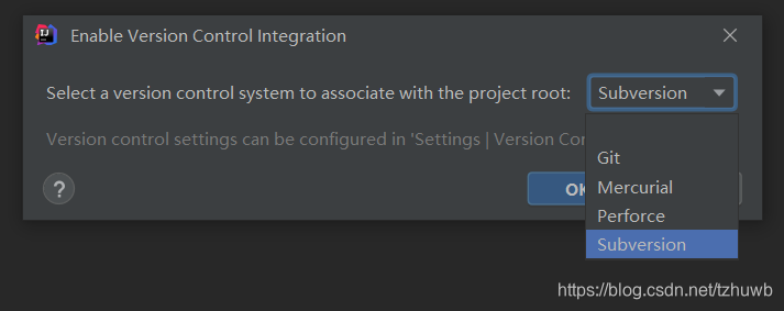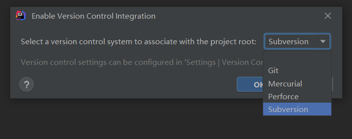 在弹出的版本控制工具中,选择 Subversion,也就是 SVN,平时使用的 VisualSVN(服务器端) 和 TortoiseSVN(客户端)都是对 Subversion 的一个集成和封装。Subversion 是 Apache 的一个自由开源的版本控制系统。