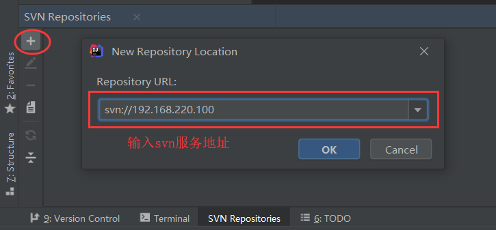 按下图操作,添加项目要存放的 SVN 服务地址,有些外网地址是以 http 或者 https 打头的,具体得看项目情况。