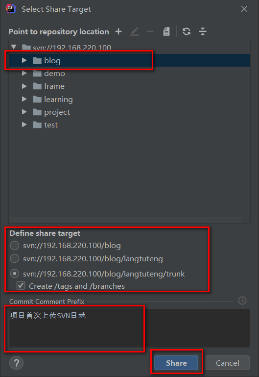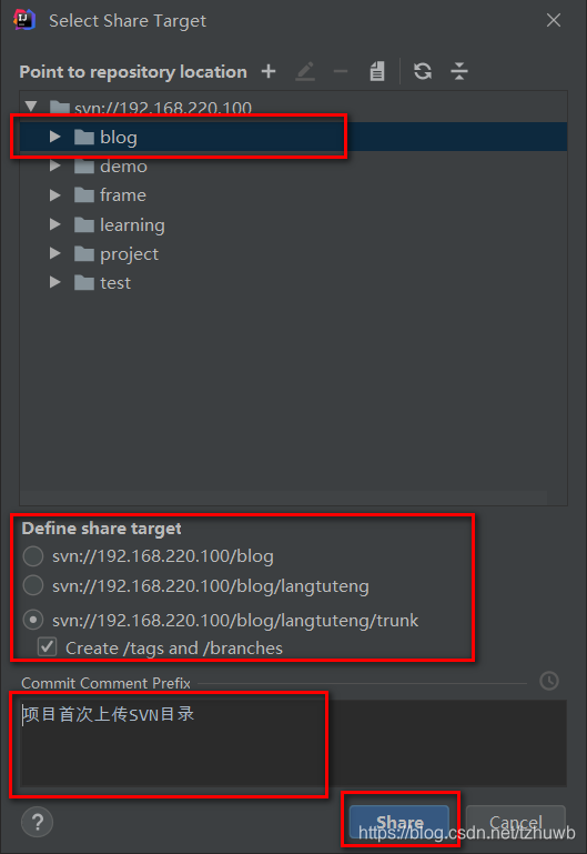 在弹出框中,需要选择项目想要存放在 SVN 的目录路径;具体路径可以在下方选择,是否直接到 trunk 目录,是否需要同时创建 branches 和 tags 目录;另外建议每次提交代码,写上注释说明,养成一个好习惯很重要。按照自己需求修改后,直接点击 Share 按钮。