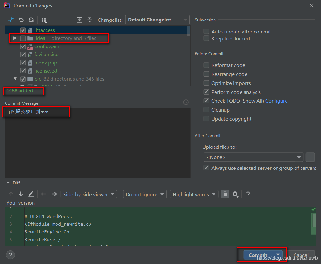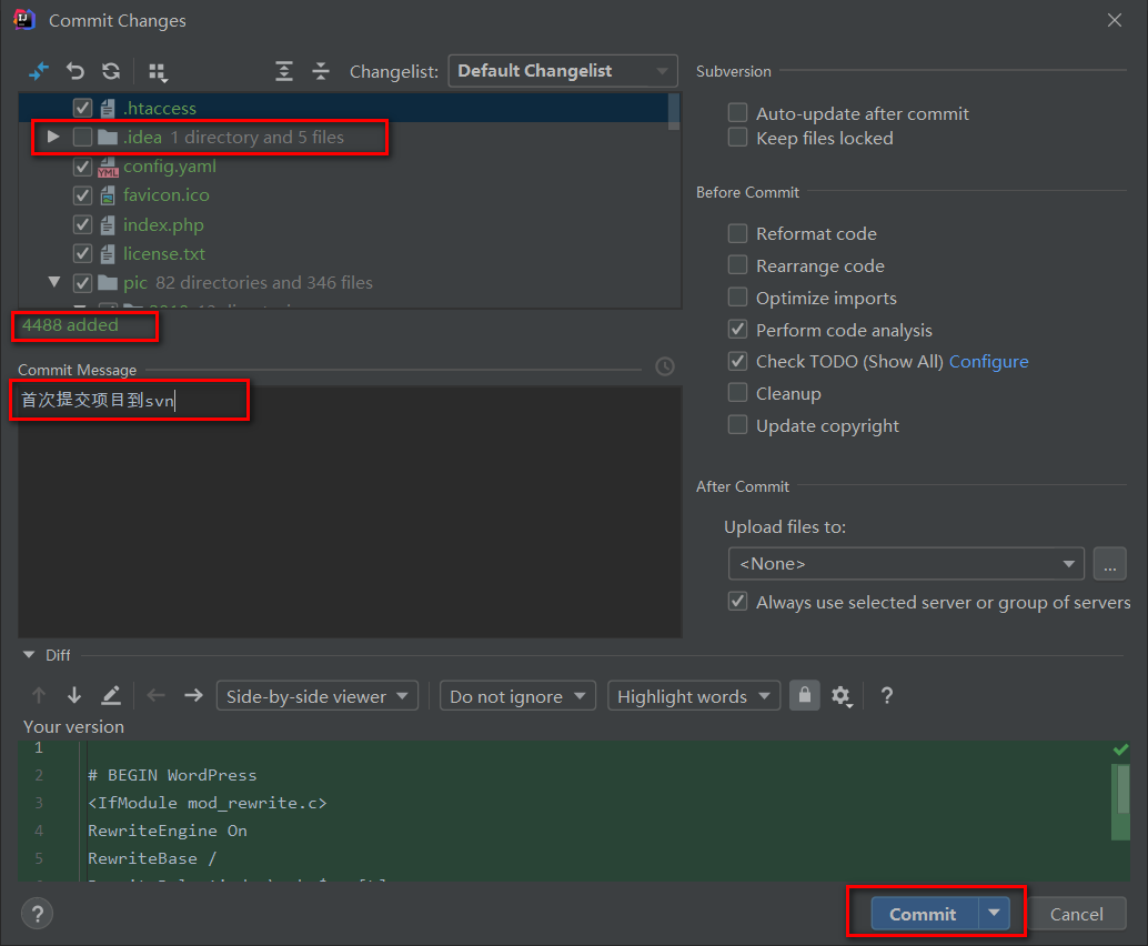 不要提交 IDEA 的配置文件,点击 Commit 按钮,提交其它所有选中的文件。