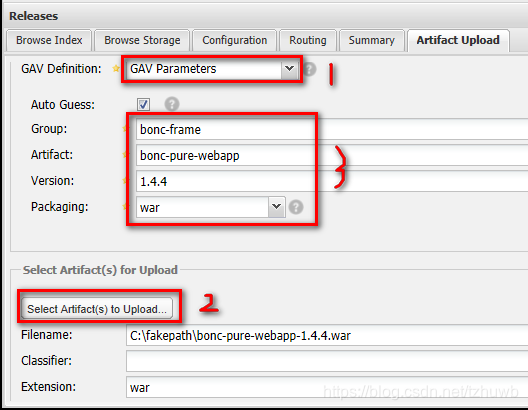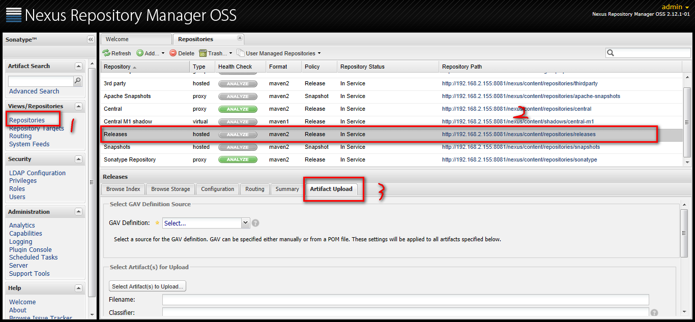 如何上传呢?有两种方式:用户可以配置 Maven 自动部署构件至 Nexus 的宿主仓库,也可以通过界面手动上传构件。