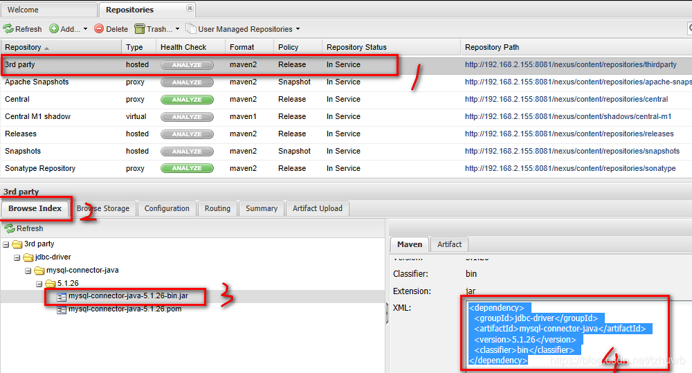 </project>添加其他的构件时,会先在 nexus 私服下载好,然后才会下载到本地。如果发现私服已经存在某一 jar 包,则会直接从私服下载,如果没有则去网络上下载。