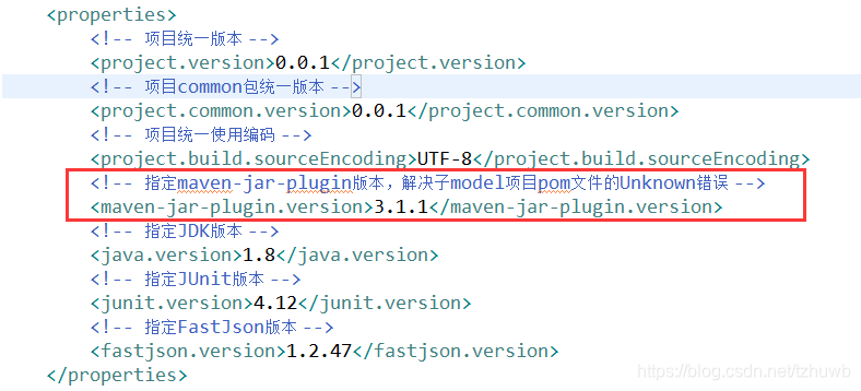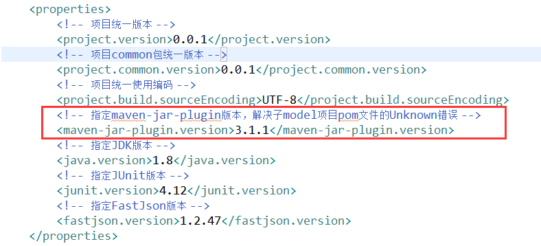 <!-- 指定maven-jar-plugin版本,解决子model项目pom文件的Unknown错误 -->