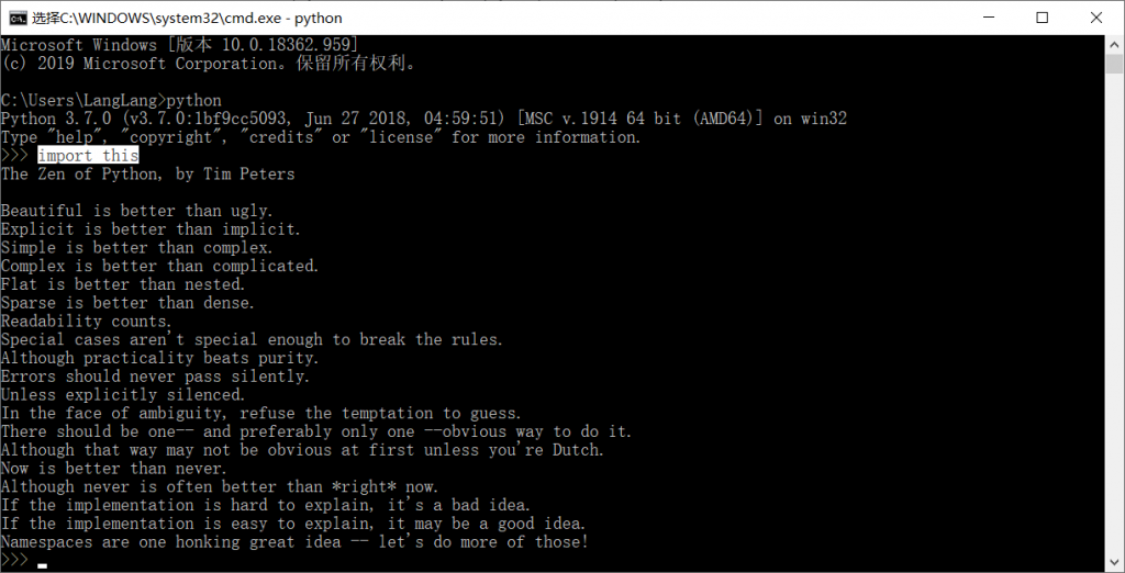 在 Python 解释器内运行 import this 可以获得完整的列表,如图所示:
