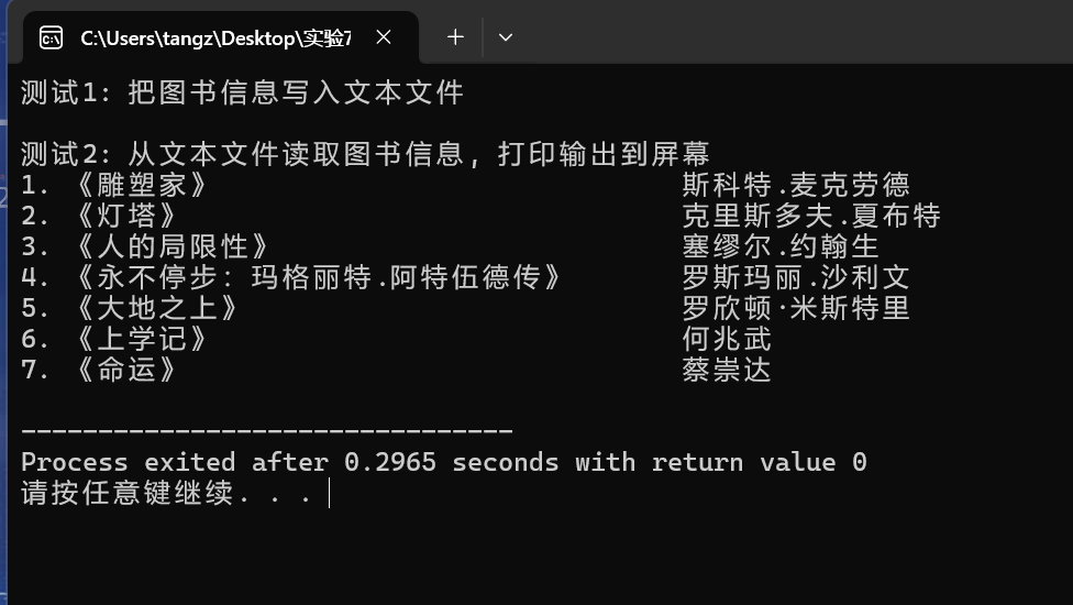 // 文件读写操作:格式化读、写文本文件 #include <stdio.h> #define N 80 #define M 100 typedef struct { char name[N]; // 书名 char author[N]; // 作者 } Book; void write(); void read(); int main() { printf("测试1: 把图书信息写入文本文件\n"); write(); printf("\n测试2: 从文本文件读取图书信息, 打印输出到屏幕\n"); read(); return 0; } void write() { Book x[] = { {"《雕塑家》", "斯科特.麦克劳德"}, {"《灯塔》", "克里斯多夫.夏布特"}, {"《人的局限性》", "塞缪尔.约翰生"}, {"《永不停步:玛格丽特.阿特伍德传》", "罗斯玛丽.沙利文"}, {"《大地之上》", "罗欣顿·米斯特里"}, {"《上学记》", "何兆武"}, {"《命运》", "蔡崇达"} }; int n, i; FILE *fp; // 计算数组x中元素个数 n = sizeof(x) / sizeof(x[0]); // 以写的方式打开文本文件data1.txt fp = fopen("data1.txt", "w"); // 如果打开文件失败,输出提示信息并返回 if(fp == NULL) { printf("fail to open file to write\n"); return; } // 将结构体数组x中的图书信息格式化写到fp指向的文件data1.txt for(i = 0; i < n; ++i) fprintf(fp, "%-40s %-20s\n", x[i].name, x[i].author); fclose(fp); } void read() { Book x[M]; int i, n; int number; FILE *fp; // 以读的方式打开文本文件data1.txt fp = fopen("data1.txt", "r"); // 如果打开文件失败,输出提示信息并返回 if(fp == NULL) { printf("fail to open file to read\n"); return; } // 从文件中读取图书信息,保存到结构体数组x中 i = 0; while(!feof(fp)) { number = fscanf(fp, "%s%s", x[i].name, x[i].author); if(number != 2) break; i++; } n = i; // 将图书信息打印输出到屏幕上 for(i = 0; i < n; ++i) printf("%d. %-40s%-20s\n", i+1, x[i].name, x[i].author); fclose(fp);