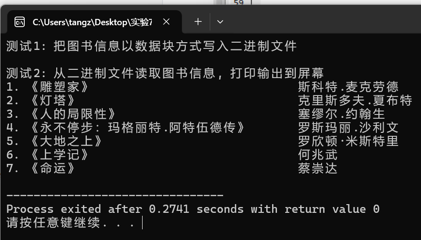 // 文件读写操作:以数据块方式读、写二进制文件 #include <stdio.h> #define N 80 #define M 100 typedef struct { char name[N]; // 书名 char author[N]; // 作者 } Book; void write(); void read(); int main() { printf("测试1: 把图书信息以数据块方式写入二进制文件\n"); write(); printf("\n测试2: 从二进制文件读取图书信息, 打印输出到屏幕\n"); read(); return 0; } void write() { Book x[] = { {"《雕塑家》", "斯科特.麦克劳德"}, {"《灯塔》", "克里斯多夫.夏布特"}, {"《人的局限性》", "塞缪尔.约翰生"}, {"《永不停步:玛格丽特.阿特伍德传》", "罗斯玛丽.沙利文"}, {"《大地之上》", "罗欣顿·米斯特里"}, {"《上学记》", "何兆武"}, {"《命运》", "蔡崇达"} }; int n; FILE *fp; // 计算数组x中元素个数 n = sizeof(x) / sizeof(x[0]); // 以写的方式打开二进制文件data2.dat fp = fopen("data2.dat", "wb"); // 如果打开文件失败,输出提示信息并返回 if(fp == NULL) { printf("fail to open file to write\n"); return; } // 将结构体数组x中的图书信息以数据块方式写入二进制文件data2.dat fwrite(x, sizeof(Book), n, fp); fclose(fp); } void read() { Book x[M]; int i, n; int number; FILE *fp; // 以读的方式打开二进制文件data2.dat fp = fopen("data2.dat", "rb"); // 如果打开文件失败,输出提示信息并返回 if(fp == NULL) { printf("fail to open file to read\n"); return; } // 从二进制文件data2.dat以数据块方式读取图书信息存储到结构体数组x i = 0; while(!feof(fp)) { number = fread(&x[i], sizeof(Book), 1, fp); if(number != 1) break; i++; } // 在屏幕上打印输出 n = i; for(i = 0; i < n; ++i) printf("%d. %-40s%-20s\n", i+1, x[i].name, x[i].author); fclose(fp); }