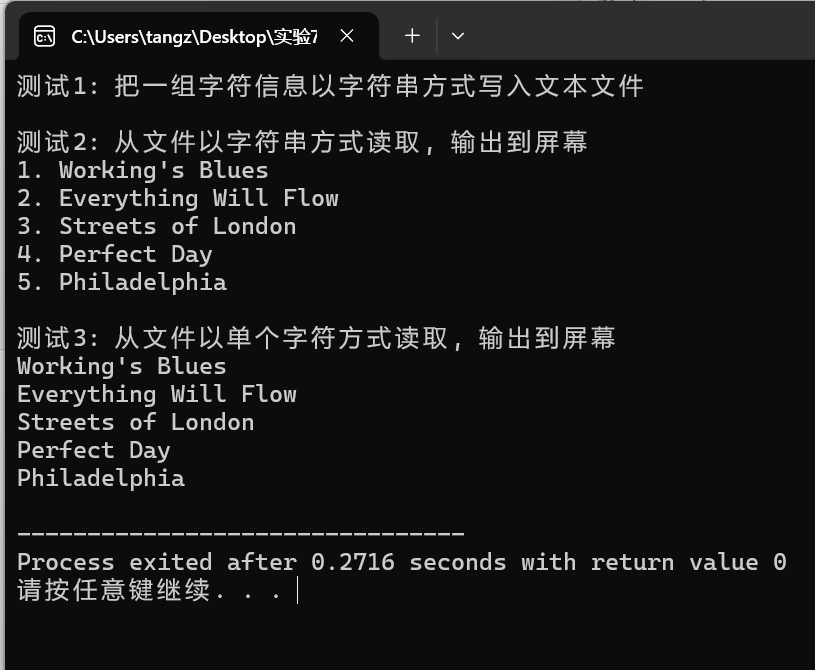 // 文件读写操作:以字符、字符串形式读、写 #include <stdio.h> #define N 5 #define M 80 void write(); void read_str(); void read_char(); int main() { printf("测试1: 把一组字符信息以字符串方式写入文本文件\n"); write(); printf("\n测试2: 从文件以字符串方式读取, 输出到屏幕\n"); read_str(); printf("\n测试3: 从文件以单个字符方式读取, 输出到屏幕\n"); read_char(); return 0; } void write() { char *ptr[N] = { "Working\'s Blues", "Everything Will Flow", "Streets of London", "Perfect Day", "Philadelphia"}; int i; FILE *fp; fp = fopen("data3.txt", "w"); if(!fp) { printf("fail to open file to write\n"); return; } for(i = 0; i < N; ++i) { fputs(ptr[i], fp); fputs("\n", fp); } fclose(fp); } void read_str() { char songs[N][M]; int i; FILE *fp; fp = fopen("data3.txt", "r"); if(!fp) { printf("fail to open file to read\n"); return; } for(i = 0; i < N; ++i) fgets(songs[i], 80, fp); for(i = 0; i < N; ++i) printf("%d. %s", i+1, songs[i]); fclose(fp); } void read_char() { char ch; FILE *fp; fp = fopen("data3.txt", "r"); if(!fp) { printf("fail to open file to read\n"); return; } while(!feof(fp)) { ch = fgetc(fp); if(ch == EOF) break; putchar(ch); } fclose(fp); }