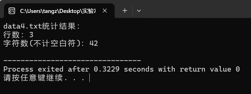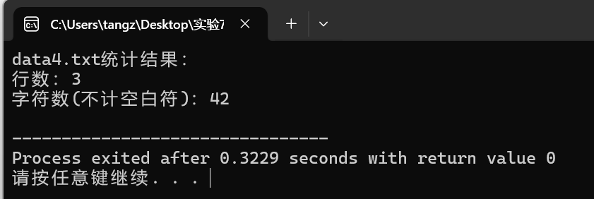 #include <stdio.h> #include <ctype.h> int main() { FILE *fp; char ch; int lines = 0; int characters = 0; fp = fopen("data4.txt", "r"); if (fp == NULL) { perror("Error opening file"); return 1; } while ((ch = fgetc(fp))!= EOF) { if (ch == '\n') { lines++; } if (!isspace(ch)) { characters++; } } // 处理文件末尾没有换行符的情况 if (characters > 0) { lines++; } fclose(fp); printf("data4.txt统计结果:\n"); printf("行数:%d\n", lines); printf("字符数(不计空白符):%d\n", characters); return 0; }