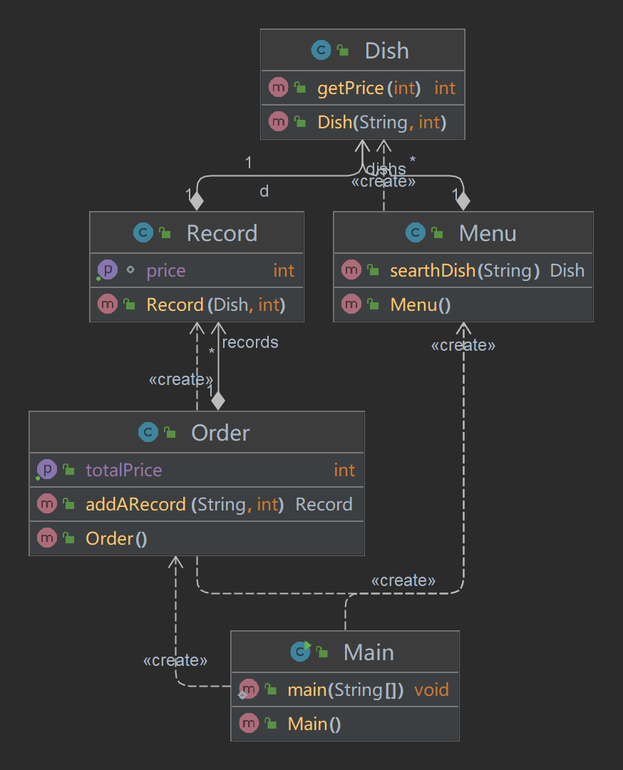 然后Record类,及菜品记录类,存下用户点的菜品的名字和对应的份额,这个相对于Dish多了一个用户输入的菜品份额,其实就是一个Dish 2.0,然后因为用户点的菜不止一个,