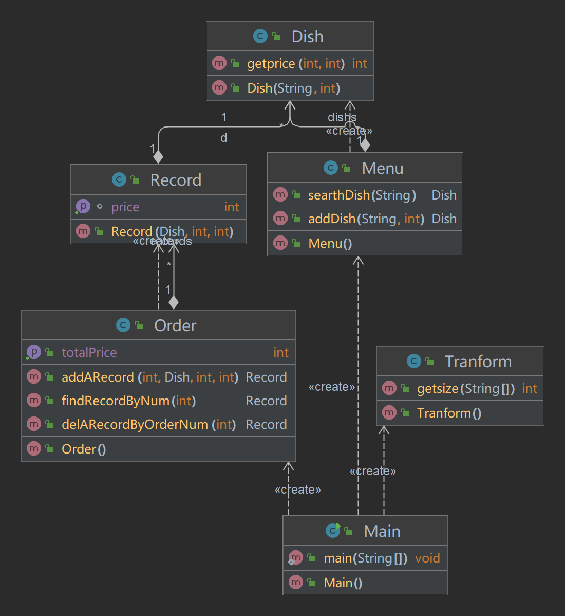所以我们用Order类保存所有的点菜记录,Order里开一个Record类的数组就行了,然后对应的在输入一条点菜记录的时候我们需要把它存进Record数组里,因此Order里需要一个