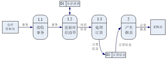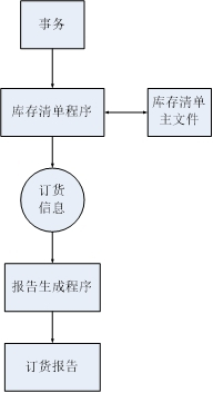 该装配厂使用一台小型计算机处理更新库存清单主文件和产生订货报告的任务。零件库存量的每一次变化称为一个事务,由放在仓库中的CRT终端输入到计算机中;系统中的库存清单程序对事务进行处理,更新存储在磁盘上的库存清单主文件,并且把必要的订货信息写在磁带上。最后,每天由报告生成程序读一次磁带,并且打印出订货报告。
