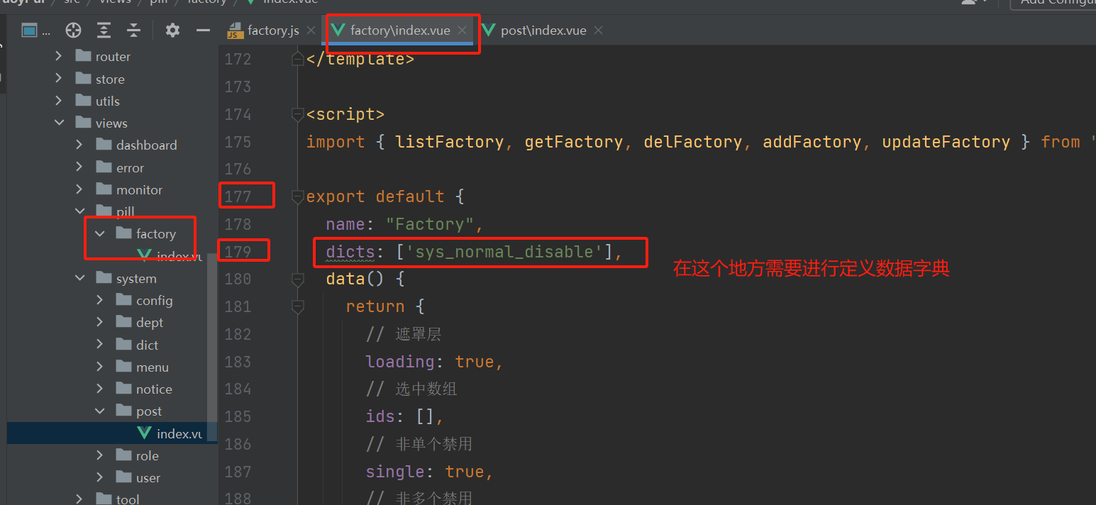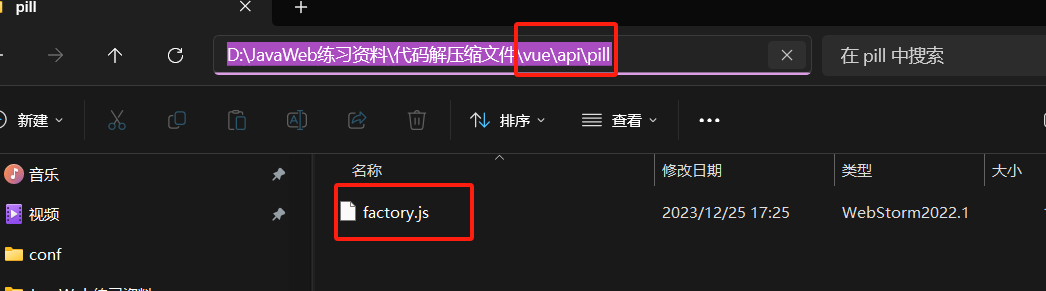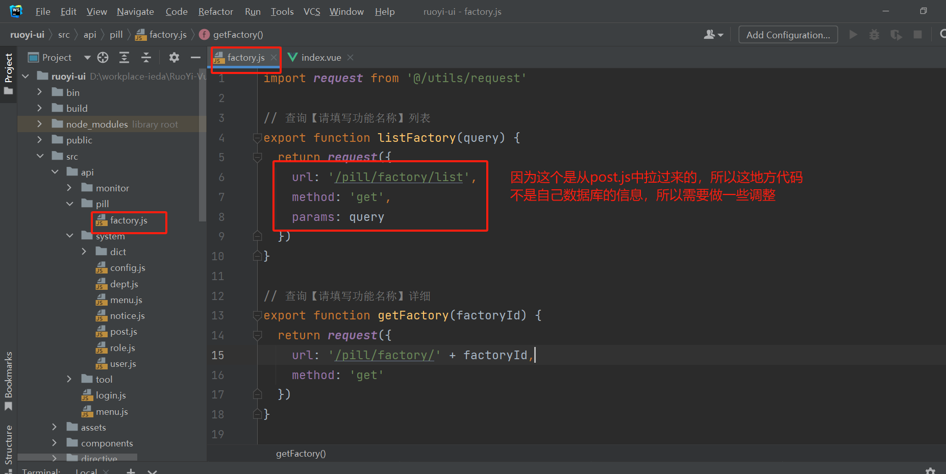 将代码生成中的vue--->api---->pill下的factory.js重新拉到webstrom中做个替换