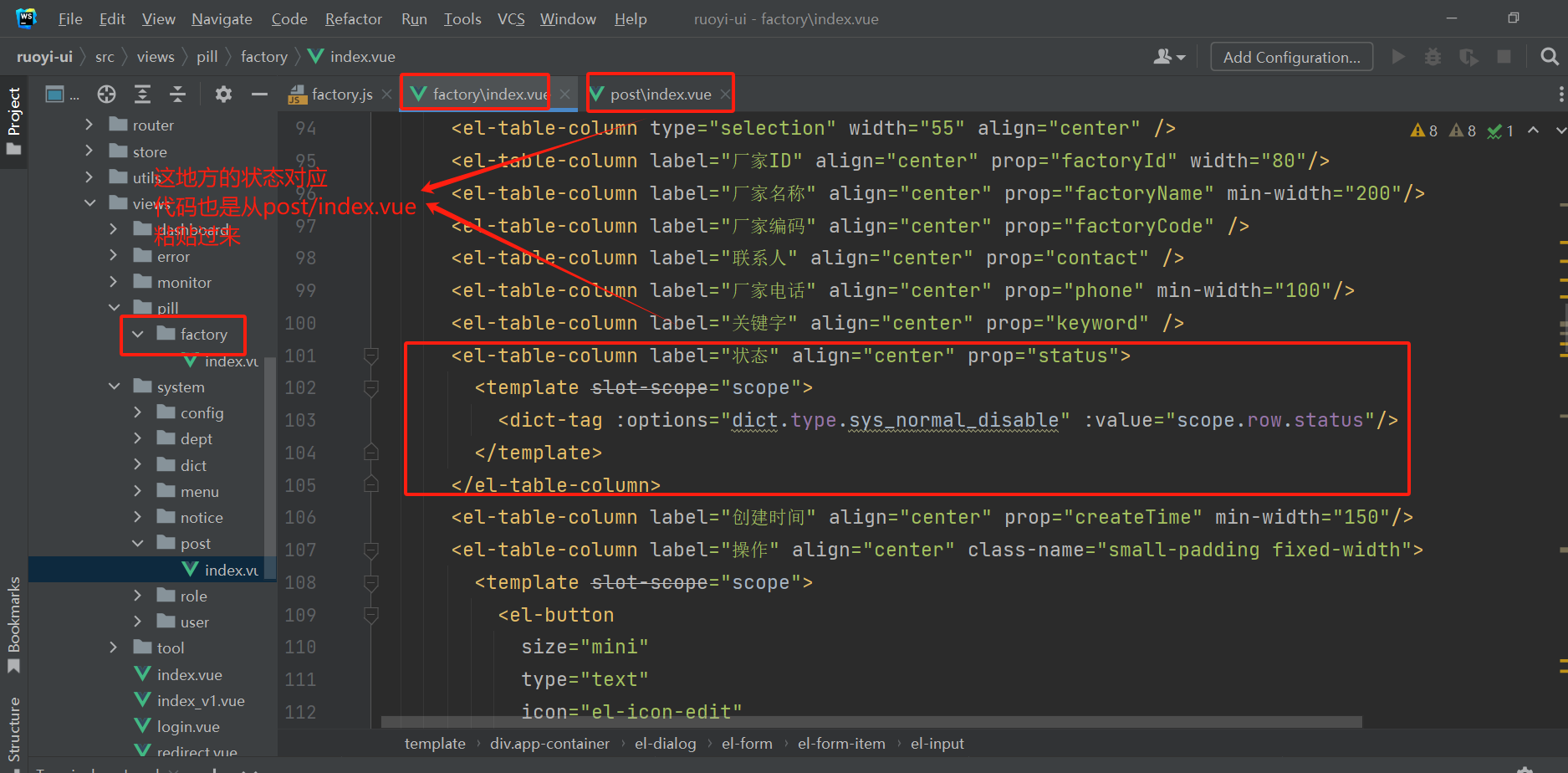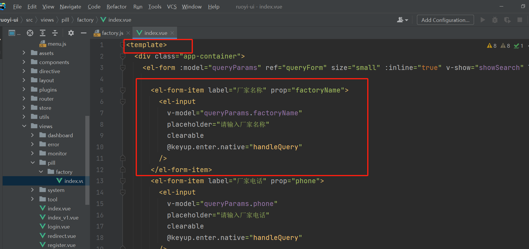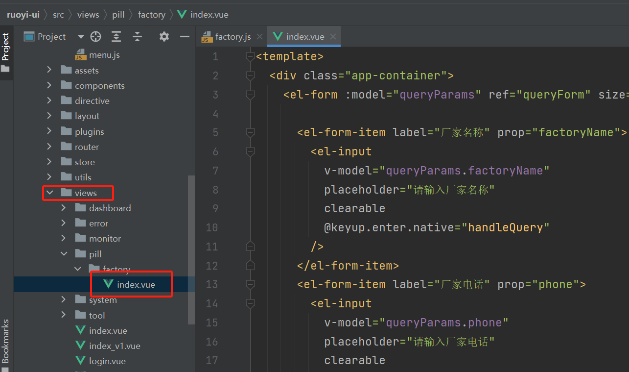 将代码生成中的vue--->views---->pill---->factory下的index.vue重新拉到webstrom中做个替换