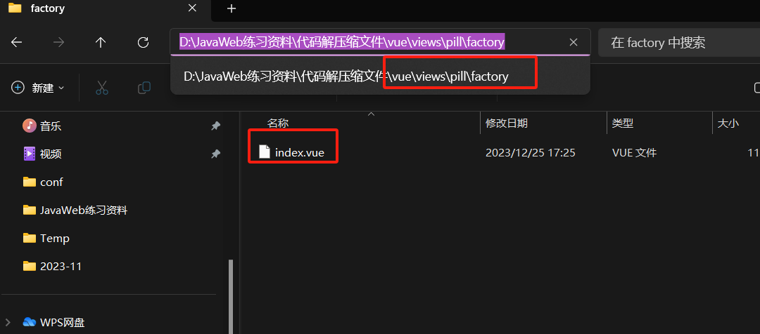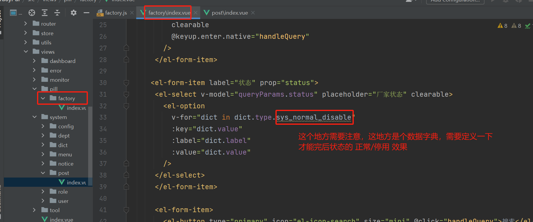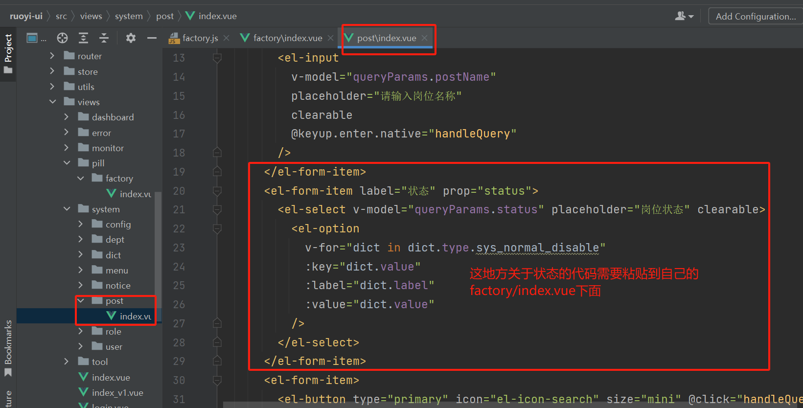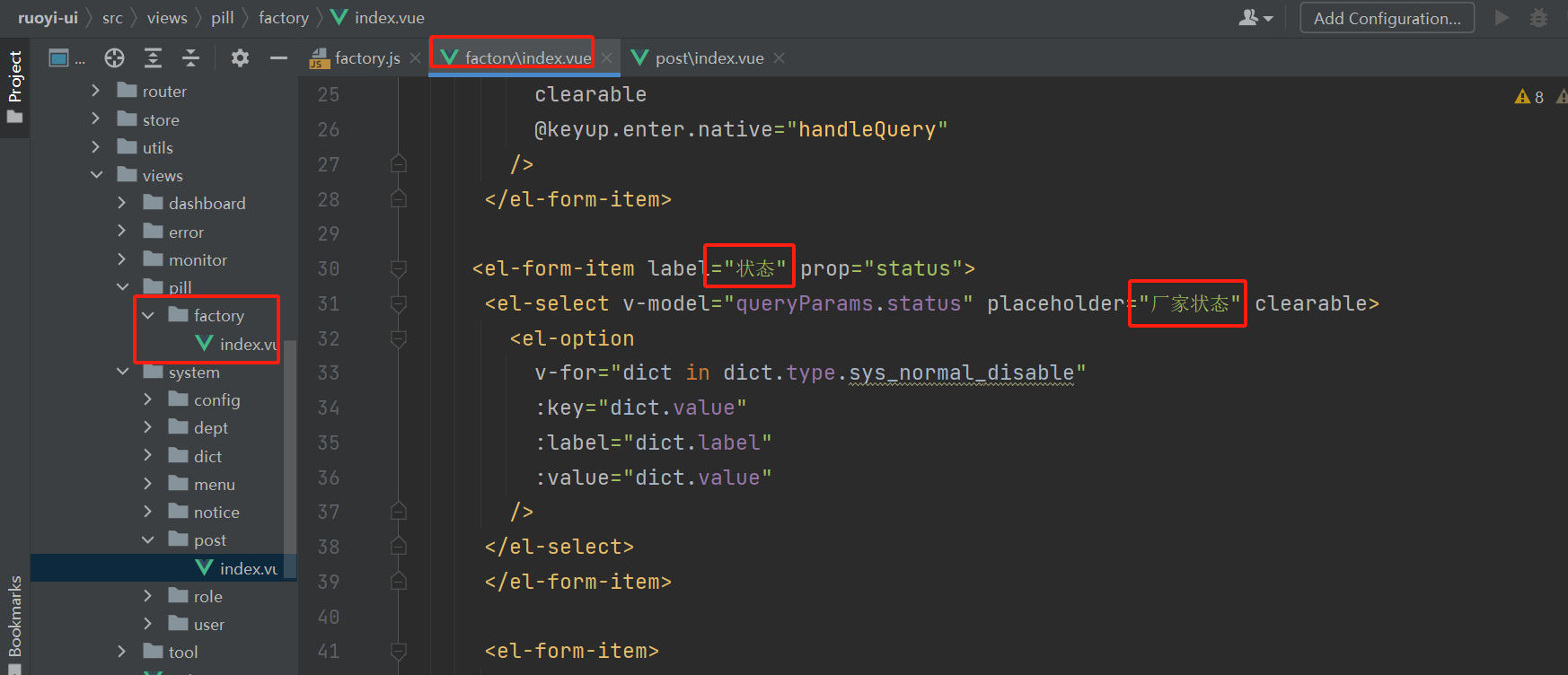 将代码生成中的vue--->views---->pill---->factory下的index.vue重新拉到webstrom中做个替换