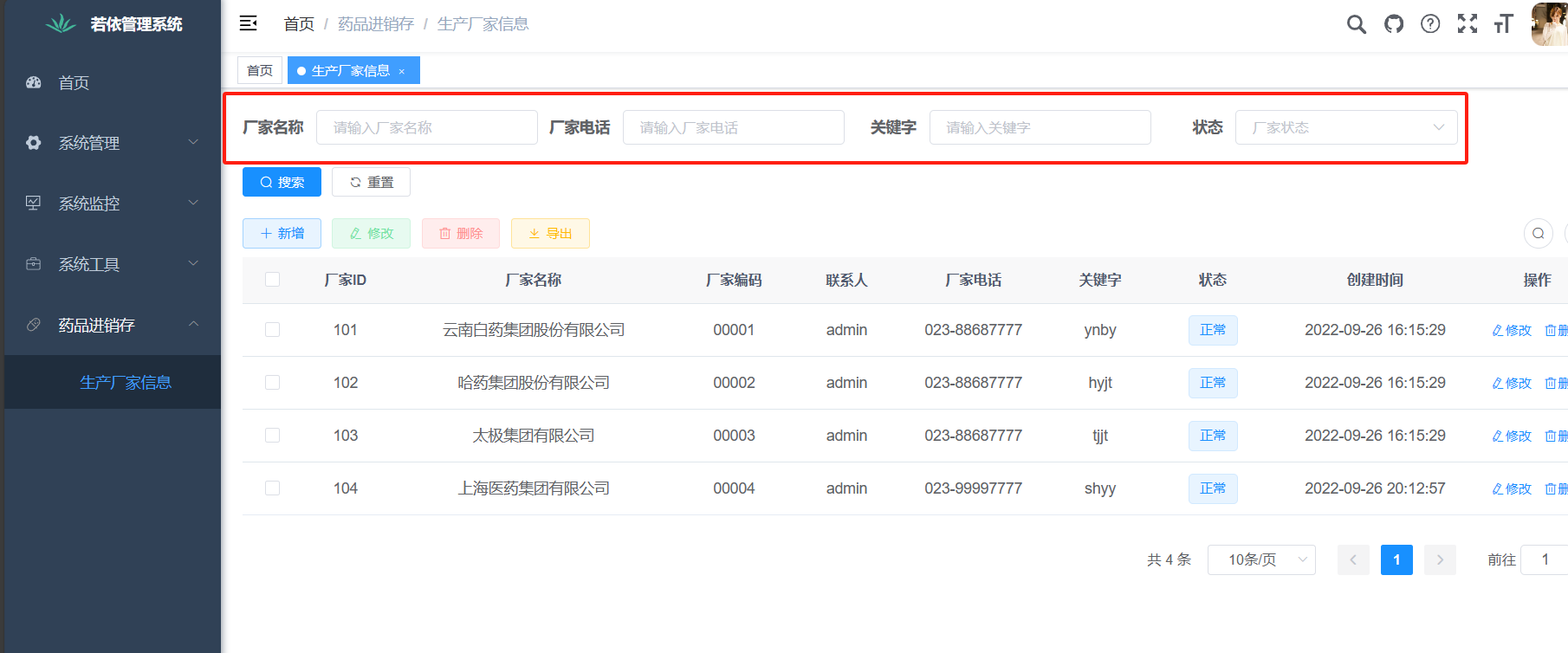 在若依后台搜索框中可以看到,只出现名称、电话、关键字、状态四个条件搜索框,但是代码生成的代码由于没有调整,可能会出现多或少的条件搜索