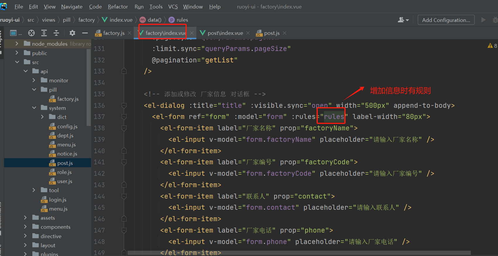 这地方在<el-dialog>中做添加和修改信息时有规则在里面: