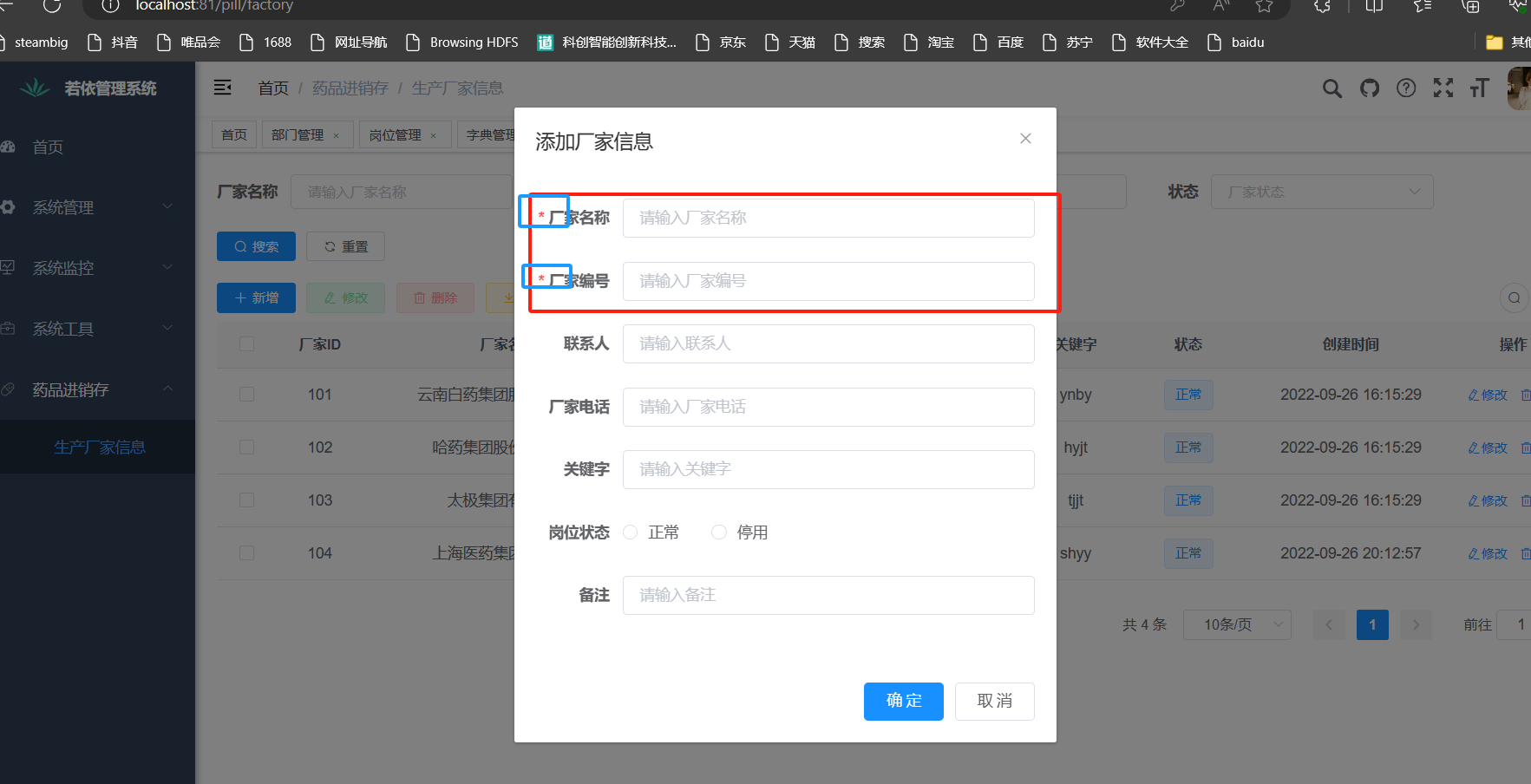 2、新增信息时,填写信息不能为空值(就是必填信息)进行修改: