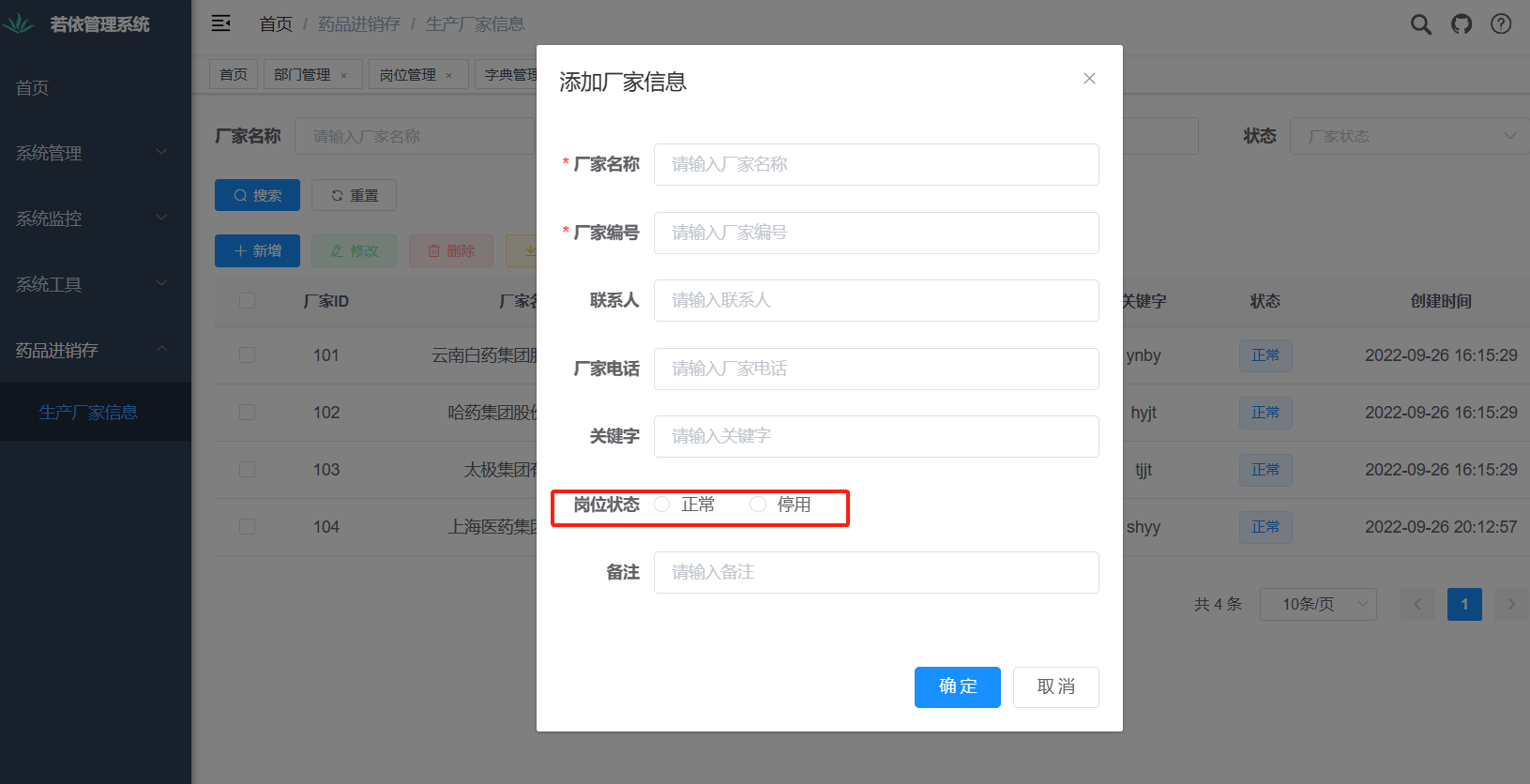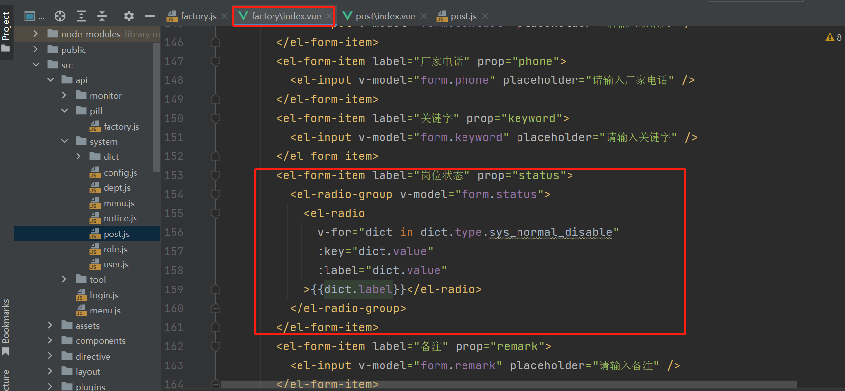 增加状态按钮:也是在<el-dialog>中进行添加,这地方也是从post\index.vue进行粘贴