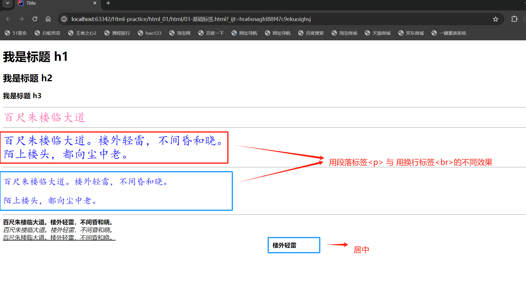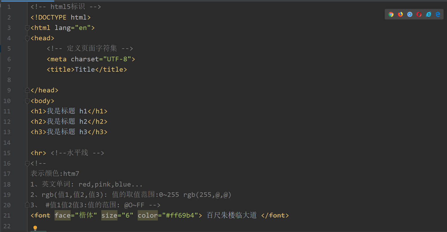 | <h1 > ~< h6> | 定义标题,h1最大,h6最小 |