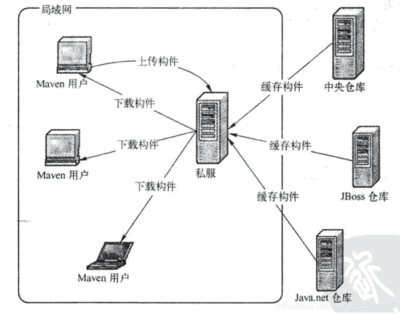 由图中可以看出,我们Maven用户是在和私服打交道,包括上传和下载构件,当私服满足不了我们的下载构件需求时,私服会和中央仓库或者其余公共仓库交互,将用户需要的构件缓存在私服仓库中。那么何为私服?