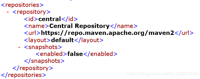 注意看该配置中的标签<snapshots></snapshots>,该标签设置为false,表示我们不从该仓库中获取不稳定的SNAPSHOT版本的构件;其实还有一个<releases></releases>标签,表示我们是否从该仓库中获取稳定版本的构件;