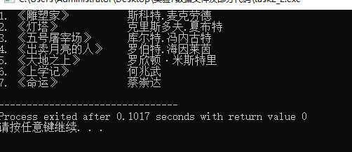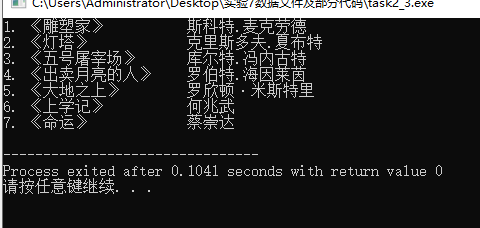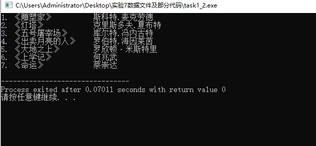 // 将图书信息写入文本文件data1.txt #include <stdio.h> #define N 80 typedef struct { char name[N]; // 书名 char author[N]; // 作者 } Book; int main() { Book x[] = { {"《雕塑家》", "斯科特.麦克劳德"}, {"《灯塔》", "克里斯多夫.夏布特"}, {"《五号屠宰场》", "库尔特.冯内古特"}, {"《出卖月亮的人》", "罗伯特.海因莱茵"}, {"《大地之上》", "罗欣顿·米斯特里"}, {"《上学记》", "何兆武"}, {"《命运》", "蔡崇达"} }; int n, i; FILE *fp; // 计算数组x中元素个数 n = sizeof(x) / sizeof(Book); // 以写的方式打开文本文件data1.txt fp = fopen("data1.txt", "w"); // 如果打开文件失败,输出提示信息并返回 if(fp == NULL) { printf("fail to open file\n"); return 1; } // 将结构体数组x中的图书信息写到fp指向的文件data1.txt // 同时也输出到屏幕上 for(i = 0; i < n; ++i){ fprintf(fp, "%-20s %-20s\n", x[i].name, x[i].author); printf("%-20s %-20s\n", x[i].name, x[i].author); } fclose(fp); return 0; }