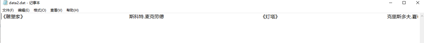 // 将图书信息写入二进制文件data2.dat #include <stdio.h> #define N 80 #define M 7 typedef struct { char name[N]; // 书名 char author[N]; // 作者 } Book; int main() { Book x[M] = { {"《雕塑家》", "斯科特.麦克劳德"}, {"《灯塔》", "克里斯多夫.夏布特"}, {"《五号屠宰场》", "库尔特.冯内古特"}, {"《出卖月亮的人》", "罗伯特.海因莱茵"}, {"《大地之上》", "罗欣顿·米斯特里"}, {"《上学记》", "何兆武"}, {"《命运》", "蔡崇达"} }; int n, i; FILE *fp; // 以写的方式打开二进制文件data2.dat fp = fopen("data2.dat", "wb"); // 如果打开文件失败,输出提示信息并返回 if(fp == NULL) { printf("fail to open file\n"); return 1; } // 将结构体数组x中的图书信息以数据块方式写入文件data2.dat fwrite(x, sizeof(Book), M, fp); fclose(fp); return 0; }