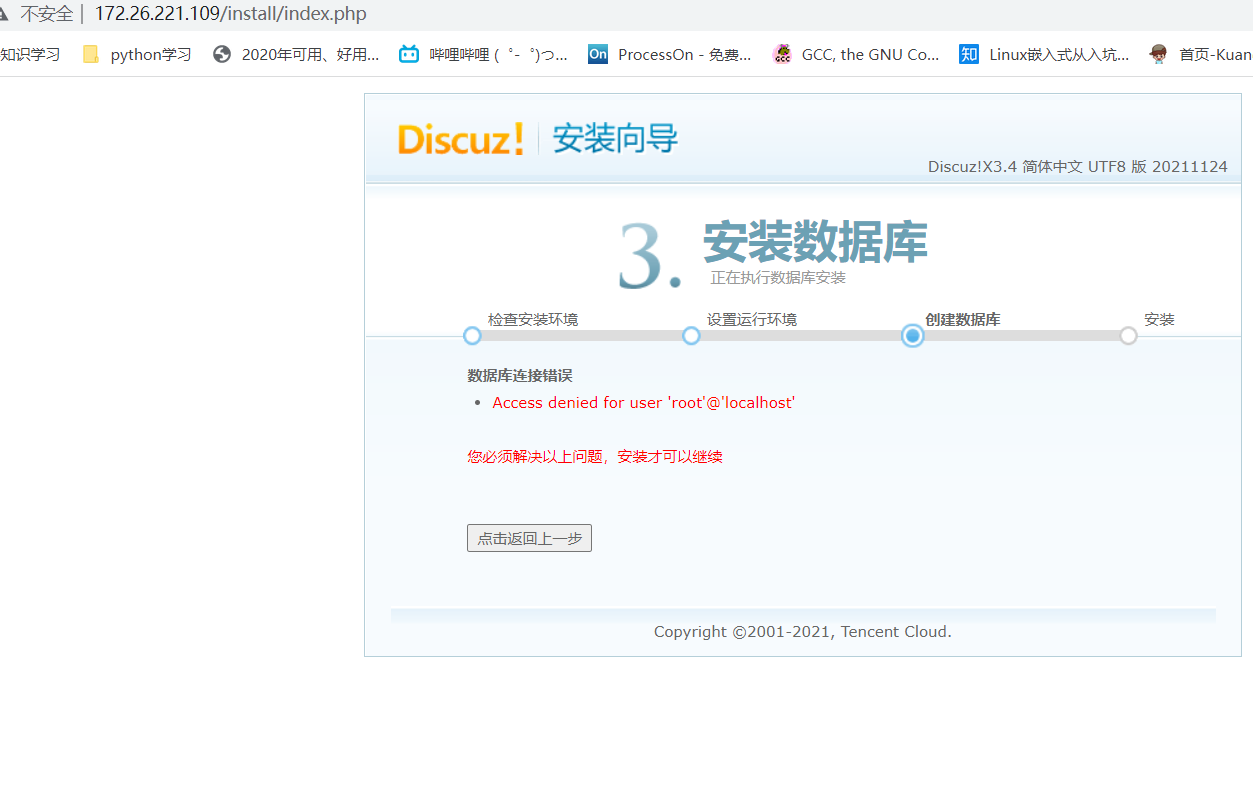 在http://172.26.221.109/install/路径下进入论坛安装界面。数据库root密码为空可能报如下错