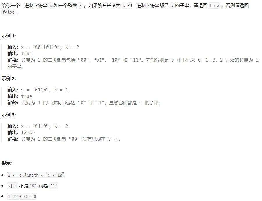 if(size - k + 1 < k_2kFang) return false;//如果长度为k的子串数量比2^k还少,说明就算所有子串符合条件也不囊括所有的长度为k的二进制