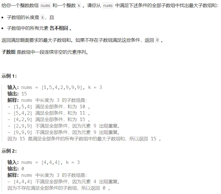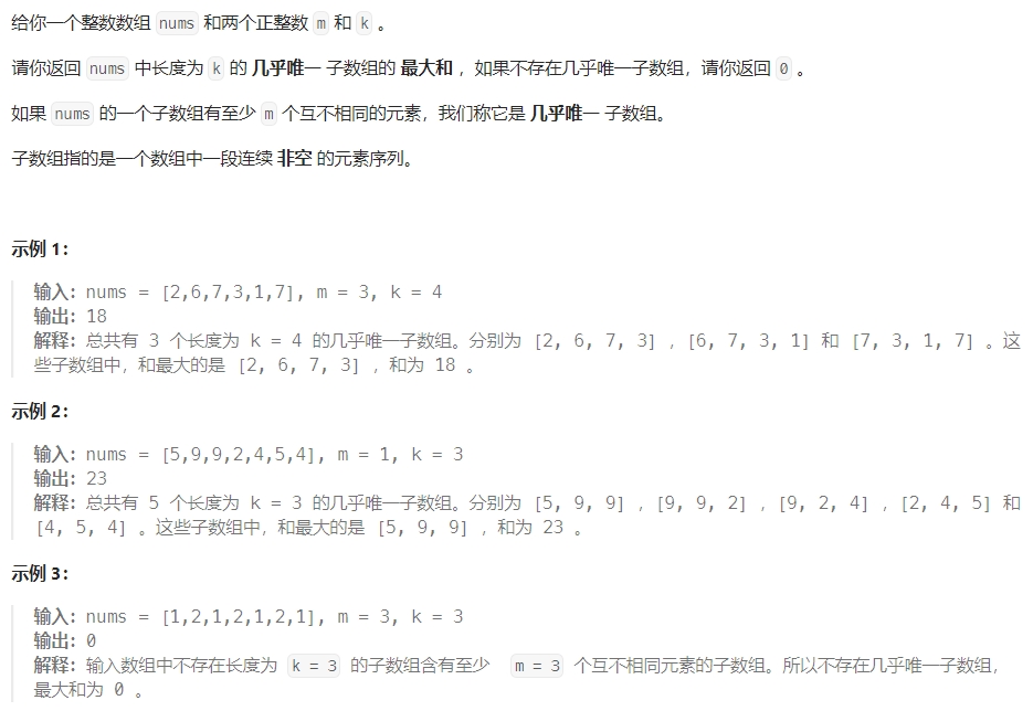 leetcode 2841. 几乎唯一子数组的最大和 2461. 长度为 K 子数组中的最大和