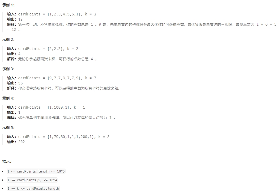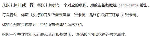 这道题解题的关键就是能不能联想到:不同的 k 次左右拿牌的过程 其实就相当于 长度为k的滑动窗口取最大值,窗口必须包含开头cardPoints[0]或者结尾cardPoints[size-1]