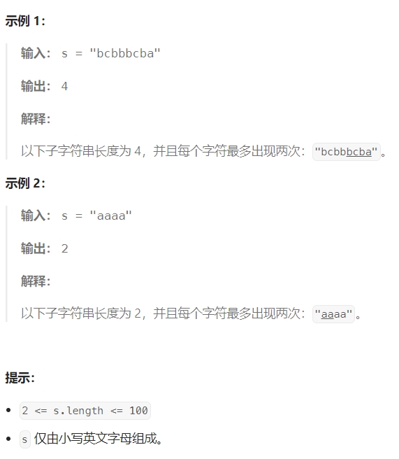 leetcode 3090. 每个字符最多出现两次的最长子字符串