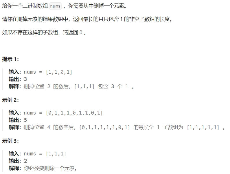 //最后我们枚举所有的元素作为待删除的元素,计算出删除这些元素之后最长的且只包含 1 的非空子数组的长度,比较并取最大值。