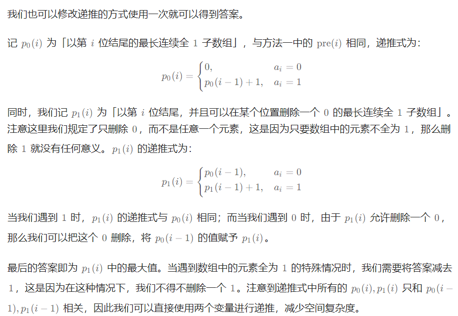 //同时,我们记 p1(i) 为「以第 i 位结尾,并且可以在某个位置删除一个 0 的最长连续全 1 子数组」。