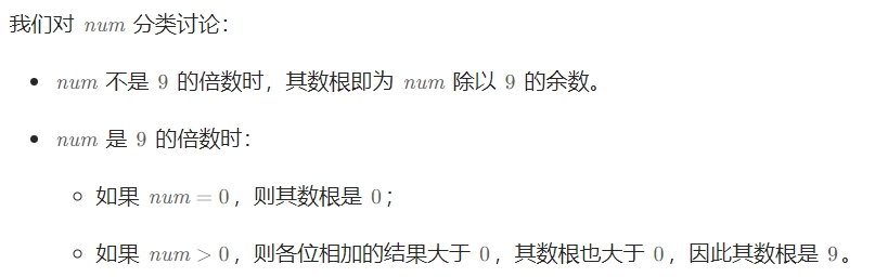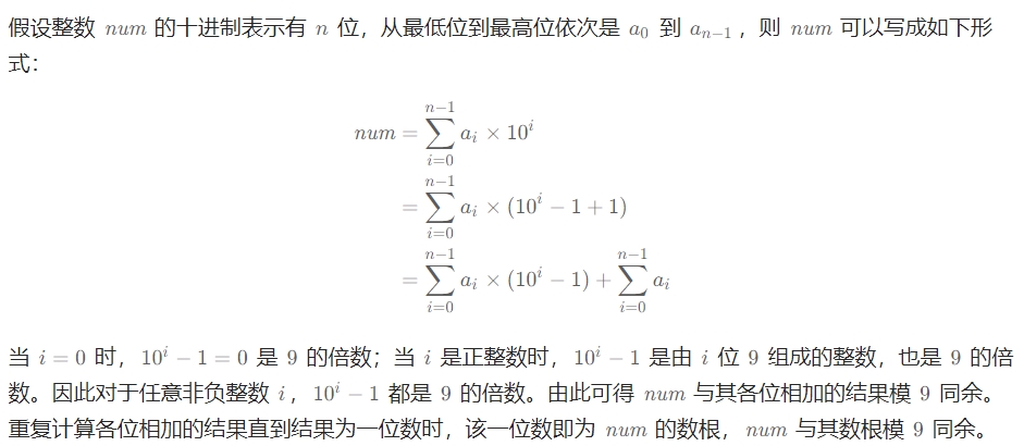 num 与其各位相加的结果模 9 同余。重复计算各位相加的结果直到结果为一位数时,该一位数即为 num 的数根,num 与其数根模 9 同余。