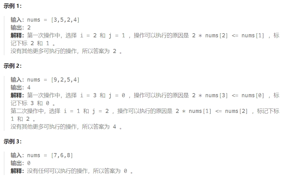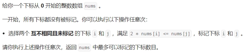 //一般地,nums[i] 要与 nums[n−k+i] 匹配。如果对于所有的 0≤i<k,都满足 2⋅nums[i]≤nums[n−k+i],那么就可以从 nums 中选出 k 个能匹配的数对。