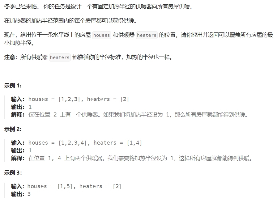 //对于每个0 ≤ i < m,需要找到下标 j 使得 abs(houses[i]−heaters[j])最小,则 heaters[j] 是和 houses[i] 距离最近的供暖器。初始时,i=j=0。