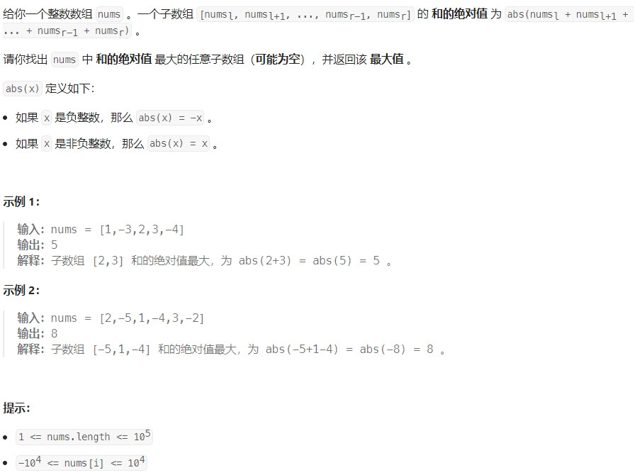 // 因为无论最大前缀和在前还是在后,与最小前缀和的差值都能反映出子数组和的最大绝对值