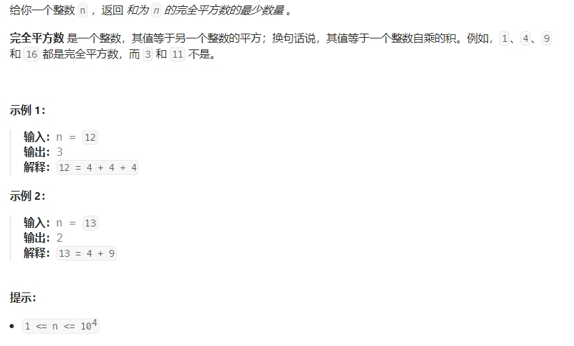 //由于 j*j 本身是一个平方数,因此组成 i 所需的最少平方数的个数就是 dp[i - j*j] + 1,即在组成 i - j*j 的基础上再加上一个平方数 j*j。