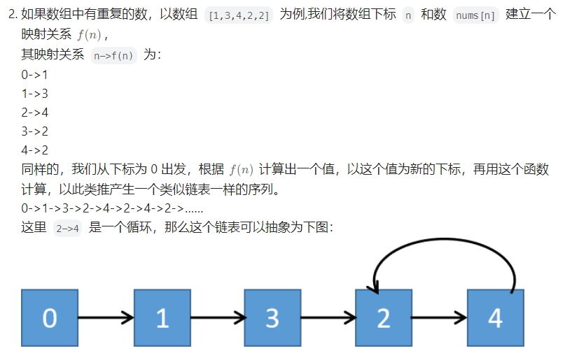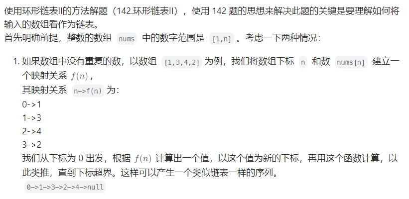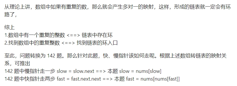 //环的存在:由于数组中存在重复数字,可以将数组视为一个链表结构,其中重复数字是环的入口点。slow 和 fast 指针最终会在环内相遇。