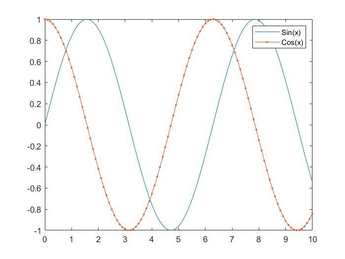 plot(x, y, x, g, '.-'), legend('Sin(x)', 'Cos(x)')