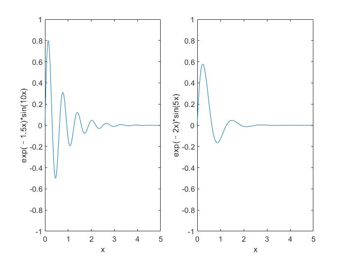 plot(x,y), xlabel('x'),ylabel('exp(–1.5x)*sin(10x)'),axis([0 5 -1 1])