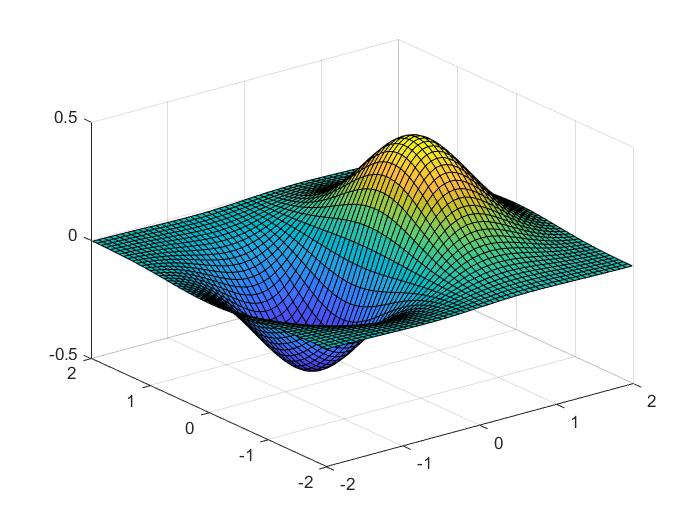 像之前一样,要定义g,首先使用meshgrid命令在函数的域上创建一组(x,y)点。 接下来,分配函数本身。 最后,使用surf命令创建一个曲面图。