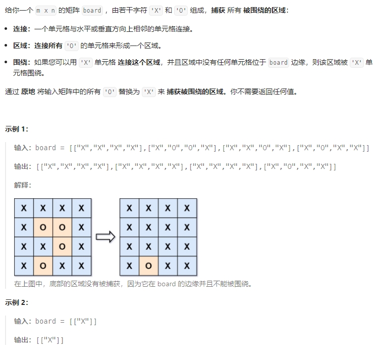 给你一个m x n的矩阵board,由若干字符'X'和'O',找到所有被'X'围绕的区域,并将这些区域所有的'O'用'X'填充。