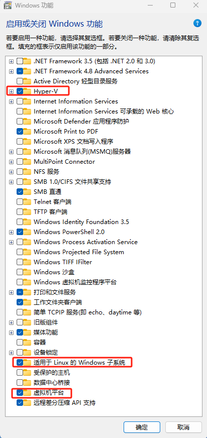 - 选择“适用于Linux的Windows子系统”与 “虚拟机平台”与“Hyper-V"