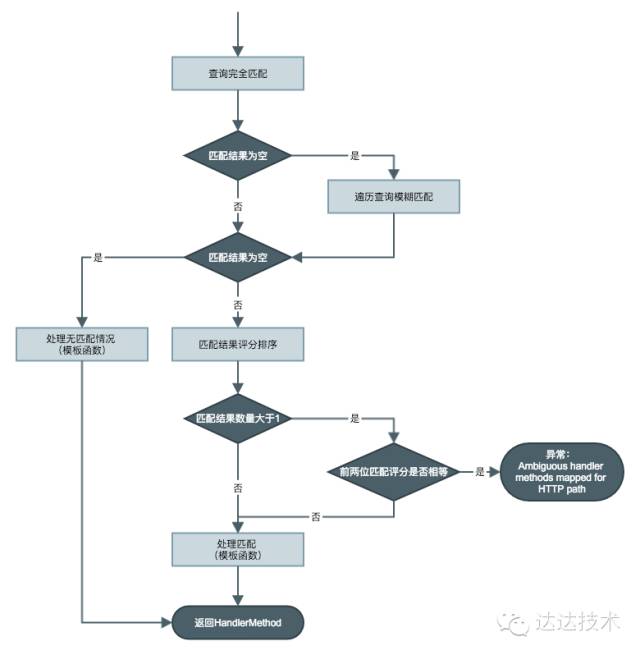 SpringMVC首先对HTTP请求中的path与已注册的RequestMappingInfo(经解析的@RequestMapping)中的path进行一个完全匹配来查找对应的HandlerMethod,即处理该请求的方法,这个匹配就是一个Map#get方法。若找不到则会遍历所有的RequestMappingInfo进行查找。这个查找是不会提前停止的,直到遍历完全部的RequestMappingInfo。