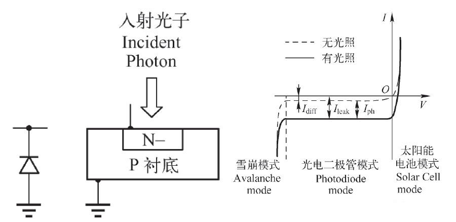 图中虚线部分为未接受到光照是,形成的反向暗电流 \(I_{diff}\) ,实线为接收到光时光电二极管的反向电流 \(I_{peak}=I_{diff}+I_{ph}\)