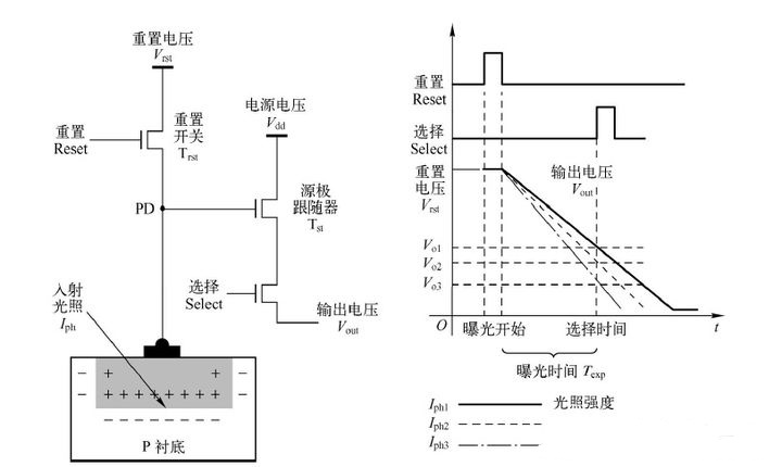 在曝光开始的时候,通过重置信号(Reset)开启重置开关 \(T_{rst}\) ,把光电二极管 PD 反向偏置到重置电压 \(V_{rst}\) 上。这个电压对 PD 的 PN结电容充电,充电的电荷量\(Q_{rst}\) 为 \(Q_{rst}=C_{PD}\times V_{rst}\) ,式中,\(C_{PD}\) 为光电二极管的PN结电容。当 \(T_{rst}\) 完成充电后关闭,光电二极管 PD 结点成为悬浮状态,当入射光强度 \(I_{ph}=0\) 时,电压 \(V_{rst}\) 和 \(Q_{rst}\) 都保持在电容 \(C_{PD}\) 上。当二极管PN结上有入射光 \(I_{ph}\) 照射时,光量子激发在PN结上产生电子-空穴对,使PN结电容上的电荷发生复合,电容上的电荷量 \(Q_{PD}\) 开始从 \(Q_{rst}\) 值下降。在受不同光照强度 \(I_{ph}\) 照射的光电二极管上,电荷量下降的速率不同。光电二极管上的电压为 \(V_{PD}=\frac{Q_{PD}}{C_{PD}}\) 。