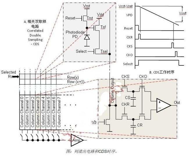 图像传感器在工作过程中,可能遇到小面积特强发光的场景,在这种场景下,拍摄到的图像中强光周围会出现强光面积扩大的情况,造成扩大区域中真实图像信息的丢失而严重影响图像质量,通常这种现象被称为 “开花” ,其原因在于图像中强光所对应的像素发生电荷溢出,即过多的光生电荷从接收到强光的像素光电二极管表面溢出,进入到周围其他像素,干扰了周边像素,从而形成虚假的强光扩大区域。 - Correlated Double Sampling(CDS) 相关双取样电路能够有效地避免固定图案噪声(Fixed Pattern Noise,FPN),具体参考 固定图案噪声